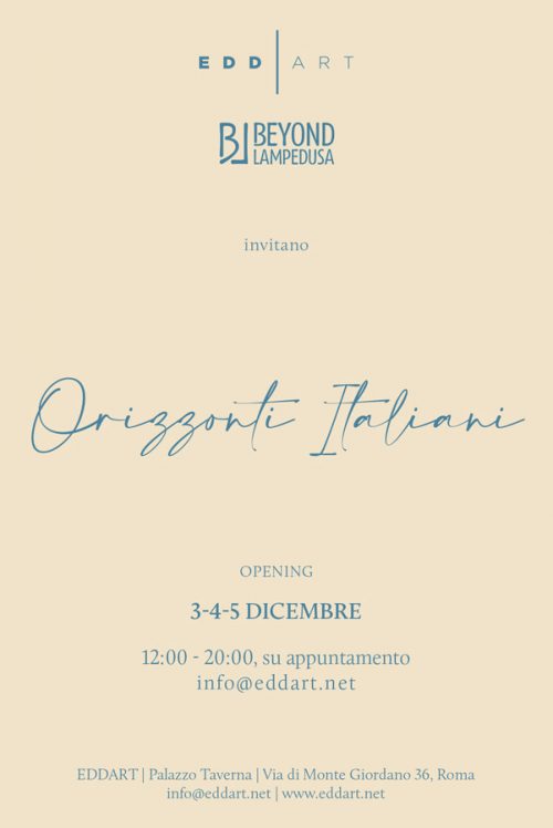 Eddart – Da giovedì 3 dicembre 2020 e fino a domenica 10 gennaio 2021, EDDart, in collaborazione con Beyond Lampedusa, presenta la mostra Orizzonti italiani negli spazi della galleria a Palazzo Taverna, Roma.